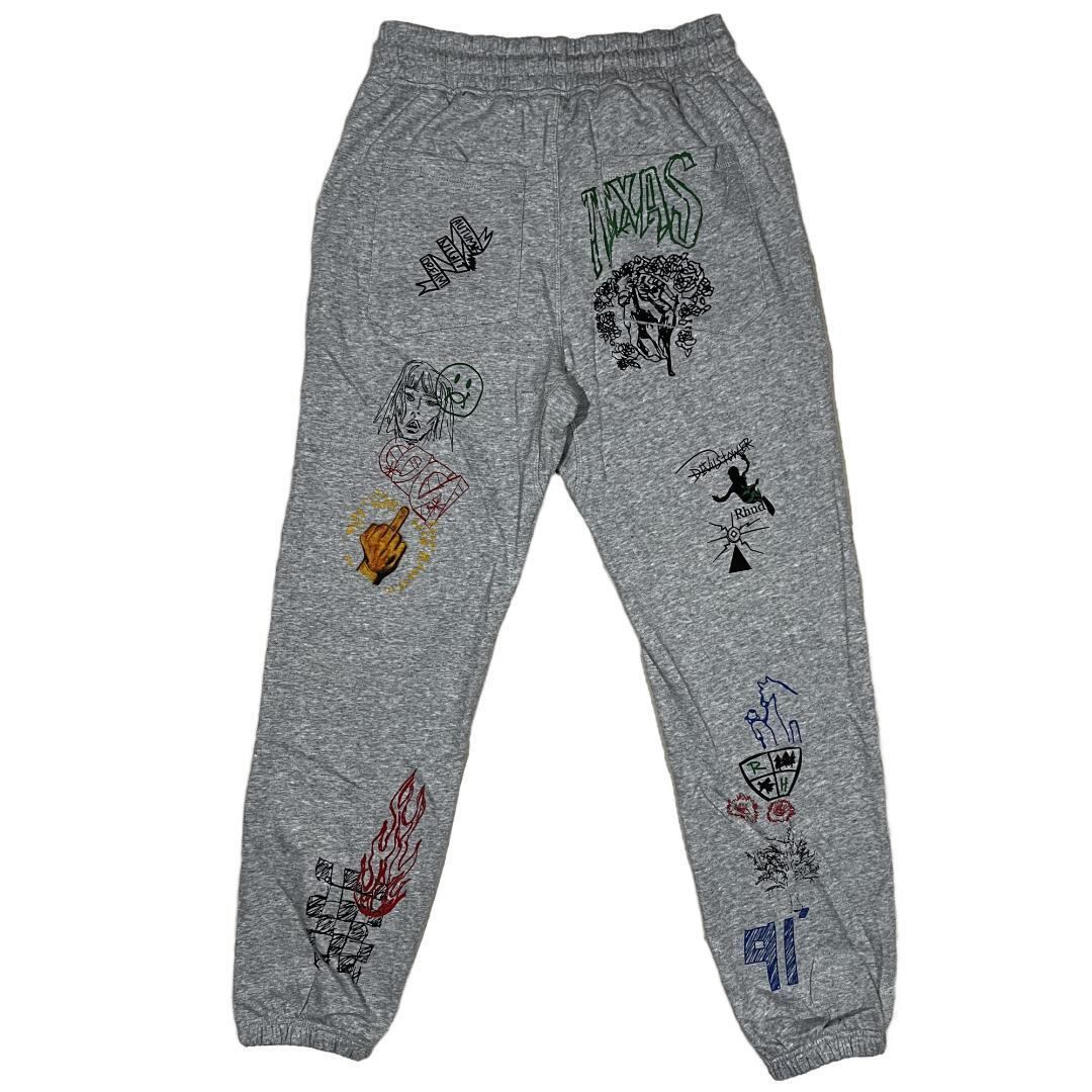 全体にルードのグラフィティなデザインのアイコンがあしらわれた、伸縮性のあるアンクルカフがついたヘビーウェイトスウェットパンツです。